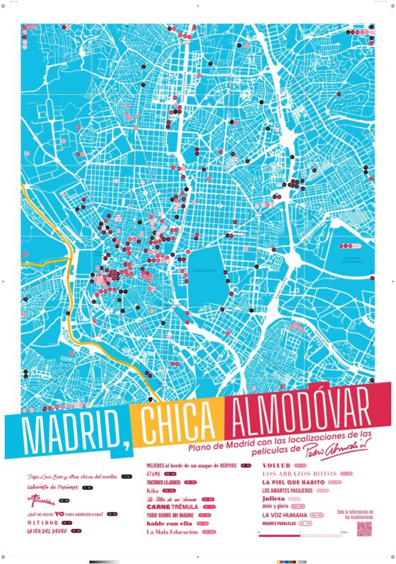 El Ayuntamiento de Madrid ha lanzado el mapa Madrid, chica Almodóvar, publicado por Ocho y Medio Libros de Cine y patrocinado por Madrid Film Office, oficina del audiovisual del Ayuntamiento, que suma la elaboración de este mapa a su línea de acciones de divulgación del patrimonio audiovisual madrileño. El mapa, que recoge 272 localizaciones madrileñas de las 23 películas del director Pedro Almodóvar, se ha diseñado como un objeto de colección en el contexto de la exposición homónima que se celebra en la sala municipal del Centro Cultural Conde Duque hasta el 20 de octubre, y se puede adquirir en la Librería Ocho y Medio, la tienda del Centro de Turismo de la Plaza Mayor y otros puntos de venta.