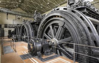 Vista de tres motores Diesel Sulzer desde la entrada de la nave.