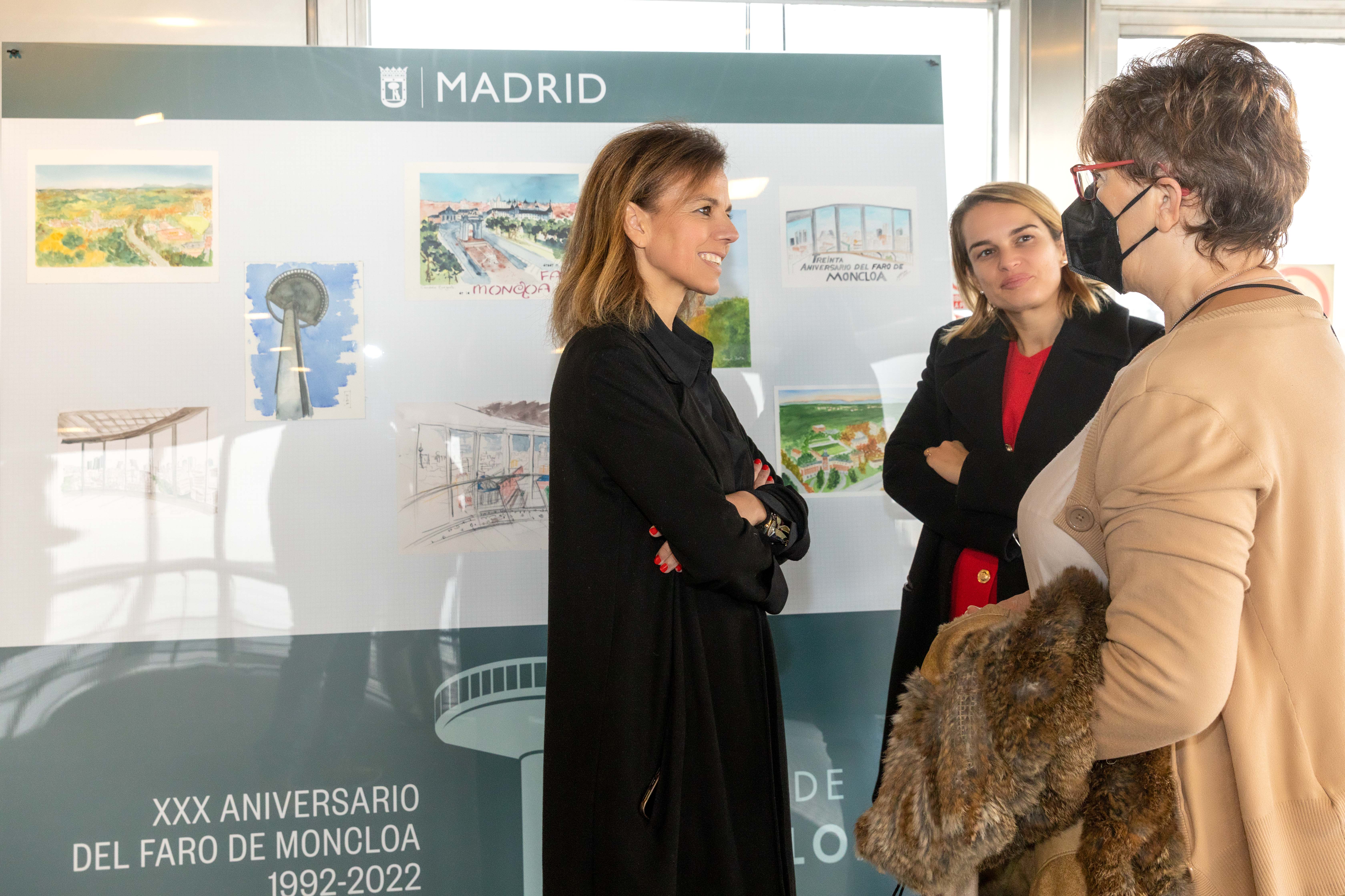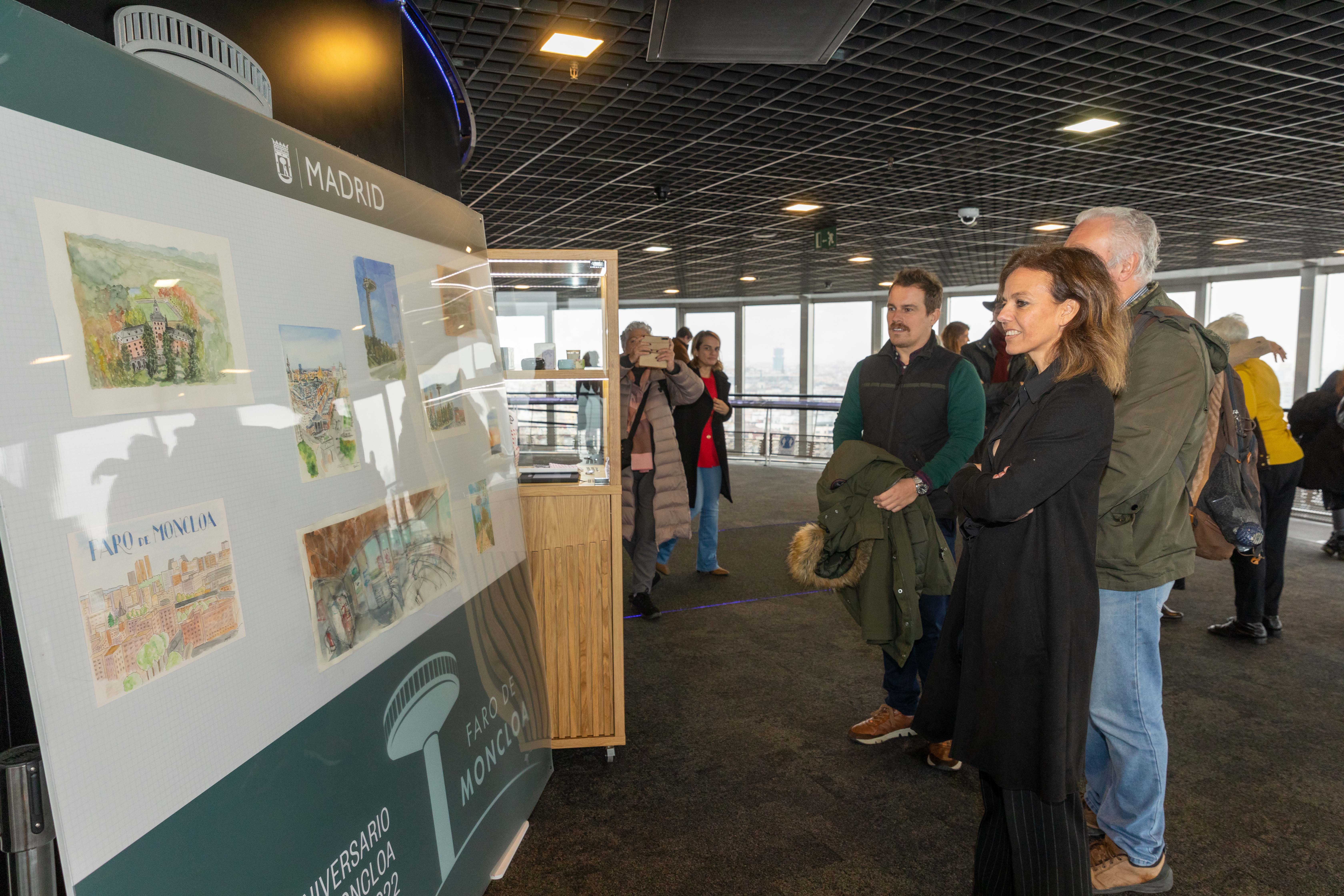Para celebrar su aniversario, el Faro de Moncloa acoge también desde hoy una exposición de dibujos de la técnica conocida como urban sketching (pintura urbana), y que ha visitado hoy la titular de Turismo. Son más de medio centenar de obras, realizadas por artistas de esta disciplina, que han participado en la convocatoria especial impulsada por el Área Delegada de Turismo del Ayuntamiento para dinamizar la imagen del mirador y de su entorno.